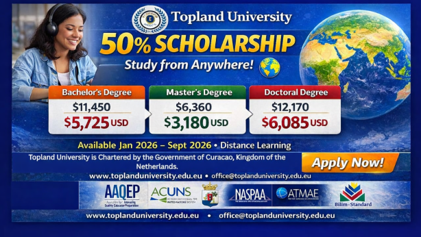 Topland University offers 50% scholarship for Bachelor’s, Master’s and Doctoral programs.